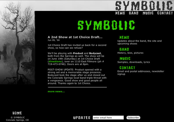 Symbolic, a Colorado Springs hard rock band, needed a site to promote themselves, and provide a central location for all band-related news and information. Items created for the site included a newsletter, photo gallery, news script and robust yet simple administrative back end for updating the site.